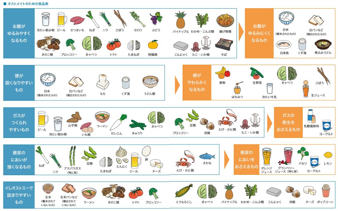 食べ物によって、便の状態やガス、においに影響が出ることがあります。以下の表を参考に、ご自身の体調や生活スタイルに合わせて、無理のない範囲で食事を工夫してみてください。